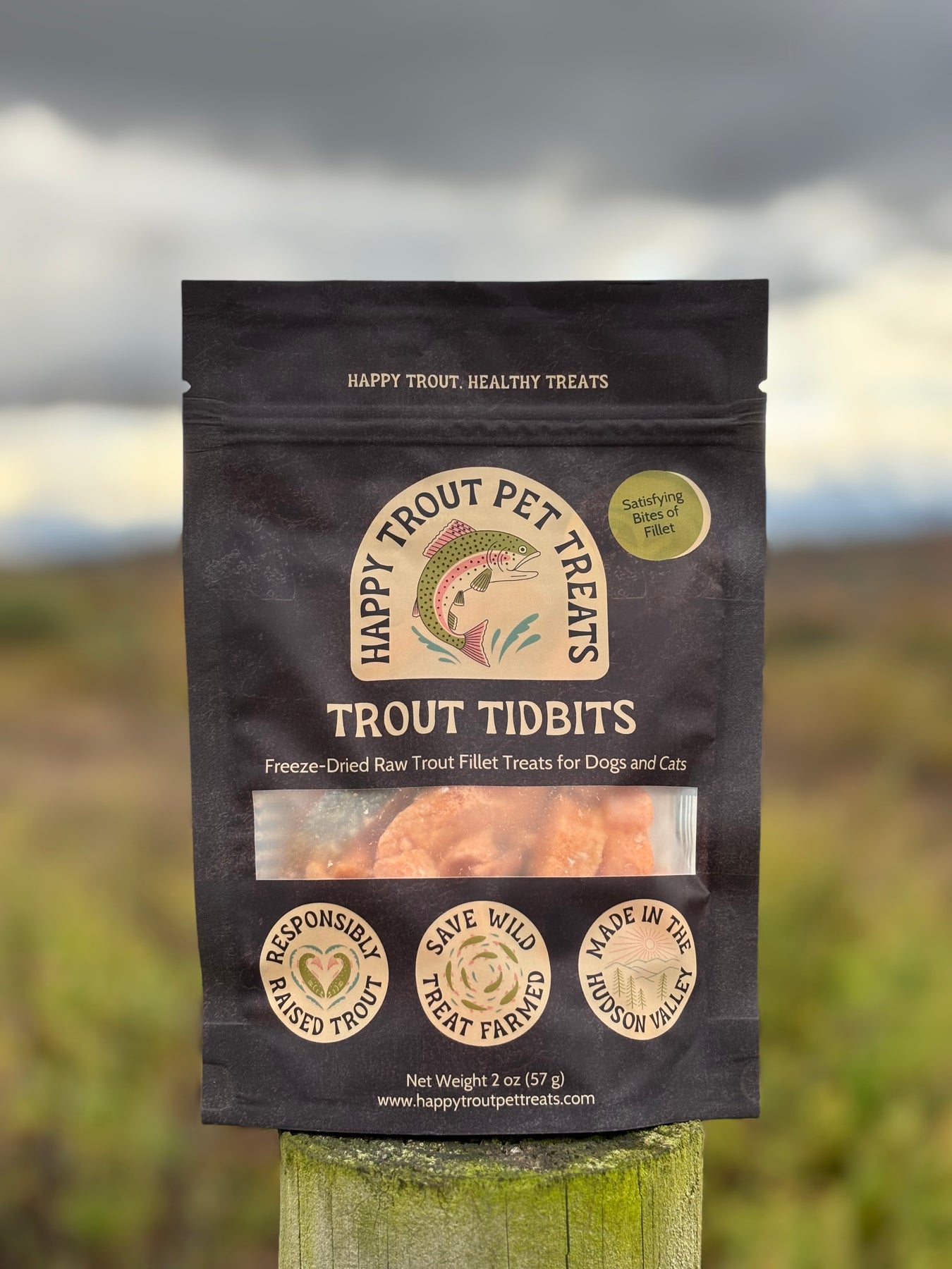 Freeze-dried raw trout fillet for the best pets!! Trout Tidbits are freeze-dried pieces of our premium steelhead trout fillets, no additives, no preservatives, just delicious and nutritious trout! Raised in a sustainable recirculating aquaculture system in Hudson, NY, these trout are humanely harvested and safely processed by hand in small batches with full traceability. Dogs and cats love these treats! Net weight 2 oz.